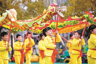 二月二,龍?zhí)ь^。3月11日,江蘇省海安高新區(qū)海南幼兒園的孩子們在操場上舞龍。當(dāng)日,該園的孩子們通過舞祥龍、賽龍舟、吃龍食、剃喜頭等一系列民俗活動,感受熱鬧的節(jié)日氛圍,體驗傳統(tǒng)文化的快樂。翟慧勇 攝
