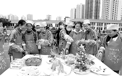 近日,重慶市永川區(qū)興龍湖小學(xué)的學(xué)生們欣賞自己烹飪的美食。該校舉行第二屆勞動(dòng)技能大賽,六年級(jí)學(xué)生在教師和家長的配合下,準(zhǔn)備食材、烹飪炒制、調(diào)味裝盤……現(xiàn)場菜香四溢,一派忙碌景象。陳仕川 攝
