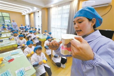 為迎接世界口腔健康日,3月18日,井岡山大學附屬醫(yī)院開展“小小牙醫(yī)體驗營”進校園活動,組織醫(yī)生為小朋友們檢查牙齒、普及日??谇槐=〕WR。圖為該院口腔科醫(yī)生指導江西吉安吉州區(qū)保育院的孩子們正確刷牙。李軍 攝