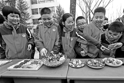 近日,甘肅省平?jīng)鍪嗅轻紖^(qū)西大街小學(xué)教育集團(tuán)學(xué)生欣賞各班選手制作的果盤。該校通過分年級(jí)組織開展疊被子、拼果盤等比賽,開展“勞體融合 成就你我”技能比賽,提高學(xué)生自理能力。吳希會(huì) 攝