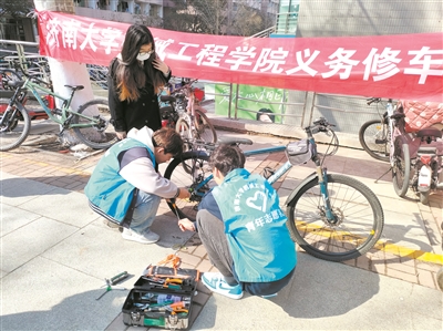 老教授口中的“小伙子”是濟南大學機械工程學院義務(wù)修車服務(wù)隊的一名隊員。修車隊創(chuàng)立于1991年,隊員們都是學院低年級的大學生,秉持“為同學服務(wù),奉獻社會”的理念,以義務(wù)修車活動為主體,利用課余時間為校園師生及周邊社區(qū)居民提供免費的自行車和電動車維修服務(wù),服務(wù)范圍涵蓋自行車和電動車的故障診斷、零部件更換、常規(guī)保養(yǎng)等方面,為校園師生和社區(qū)居民的出行提供便利。成立33年來,修車隊累計修車1.7萬余輛,志愿者服務(wù)時間超過1.05萬小時。