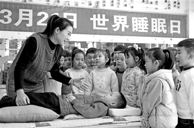 3月20日,在山東省棗莊市紅旗小學幼兒園,教師向小朋友們講解健康睡眠常識。今年3月21日是第24個世界睡眠日,主題為“健康睡眠,人人共享”。紅旗小學幼兒園開展相關(guān)活動,引導小朋友們從小養(yǎng)成良好的睡眠習慣。吉喆 攝
