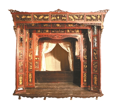 現(xiàn)收藏于中南民族大學(xué)民族學(xué)博物館的土家族三滴水床,為清代原件,黃楊木制,屬大型雕花家具。床寬、高各2.68米,進(jìn)深2.51米,內(nèi)鋪長(zhǎng)2.1米,寬1.4米。整張床全部采用傳統(tǒng)的榫卯結(jié)構(gòu)制作而成,工序繁多,工藝復(fù)雜,刻花板檐額三層,呈喇叭狀由內(nèi)向外擴(kuò)展,上雕蝙蝠、花瓶、服飾、房屋、金瓜及各種花草等,雕花圖案大多有“取諧音喻吉祥”之意。蓮花寓意著蓮生貴子;金瓜寓意著瓜瓞綿綿;蝙蝠寓意著福壽如意;花瓶中插著蓮花與三根戟,寓意“平平安安、連升三級(jí)”。浮雕、鏤雕相映成趣,堪稱(chēng)土家族雕刻藝術(shù)精品。
