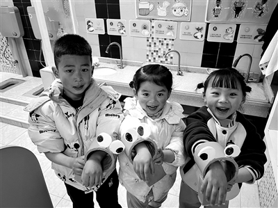 活動(dòng)過程:教師將制作出的大嘴巴青蛙擺放在洗手池邊,幼兒每次洗手時(shí)都能看見。洗手前,幼兒挽起衣袖,將手伸進(jìn)青蛙嘴巴里比一比,衣袖位置到青蛙嘴巴即可洗手。針對(duì)幼兒身高的個(gè)體差異,為方便幼兒操作,青蛙沒有固定在洗手池邊,幼兒可根據(jù)自己的身高,選擇站立拿起青蛙比一比或放在池邊比一比。大嘴巴青蛙投放后,幼兒洗手的主動(dòng)性與積極性明顯提高,在與大嘴巴青蛙互動(dòng)的過程中增加了愉悅感,而且能有意識(shí)地主動(dòng)挽起衣袖,挽袖技能也不斷增強(qiáng)。幼兒逐漸理解,挽袖子不是一件麻煩事,反而很有意思,也養(yǎng)成了愛洗手、講衛(wèi)生的好習(xí)慣。