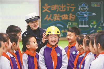 3月25日是全國中小學生安全教育日,山東省青島市公安局交通警察支隊李滄大隊民警當天走進青島汾陽路小學,講解交通安全知識,引導學生文明出行。圖為民警給學生講解如何正確佩戴頭盔。張鷹 攝