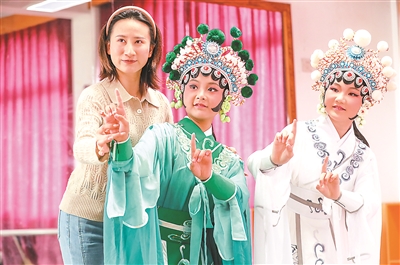 近日,在浙江省湖州市德清縣新安鎮(zhèn)勾里中心學(xué)校,戲曲教師在指導(dǎo)學(xué)生練習(xí)戲曲。近年來,該校積極開展“戲曲進(jìn)校園”活動,聘請專業(yè)戲曲演員每周固定時間進(jìn)校傳授,讓學(xué)生近距離感受戲曲文化的魅力,增進(jìn)對傳統(tǒng)國粹的了解和傳承。王樹成 攝