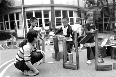 說完,3名幼兒分頭找來方形積木搭建,終于成功。