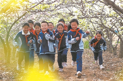 4月8日,在山東濰坊高密市膠河生態(tài)發(fā)展區(qū),祝家莊小學學生在梨園里快樂奔跑。在該校周邊田野里,梨花、桃花、油菜花競相開放,一片生機盎然,學生在教師指導下賞花、嬉戲、體驗勞動,在燦爛的花海中感受春天。李海濤 攝