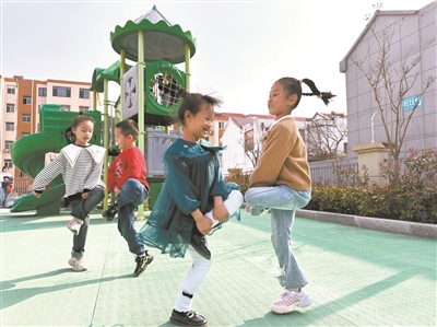 日前,山東省榮成市第三實(shí)驗(yàn)幼兒園的幼兒在玩“斗雞”。該園重視傳統(tǒng)體育游戲的開展,將“老鷹捉小雞”“斗雞”“打沙包”等游戲融入幼兒的一日生活,不僅促進(jìn)了幼兒跑、跳、鉆等大肌肉動作的發(fā)展,也鍛煉了幼兒的手眼協(xié)調(diào)能力和身體平衡能力,提升了幼兒的溝通能力和規(guī)則意識。 劉景萍 攝