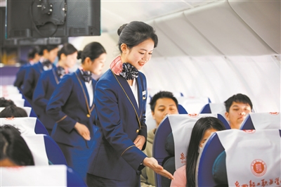 近日,在泉州輕工職業(yè)學(xué)院新配置的國產(chǎn)大飛機(jī)C919同款航空模擬機(jī)艙內(nèi),該校空中乘務(wù)專業(yè)學(xué)生正在進(jìn)行安全提醒服務(wù)訓(xùn)練。近年來,該校實(shí)行“訂單式”辦學(xué),為各行業(yè)培育職業(yè)人才。謝貴明 攝