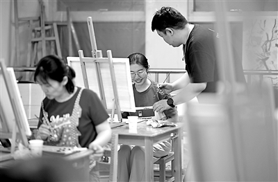 4月26日,在天津青年宮,青年夜校教師指導(dǎo)學(xué)員學(xué)習(xí)油畫。2023年底,由天津團(tuán)市委主辦的“天津市青年夜?!逼放苹顒?dòng)正式啟動(dòng),免費(fèi)或低價(jià)為年輕人提供豐富多彩的特色課程。熱門課程往往一上線就被搶光,供不應(yīng)求。