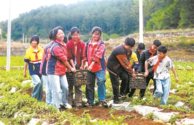 近日,貴州省黔西市文峰街道黎明小學學生在水西街道石園社區(qū)的土豆基地搬運土豆。該校組織教師,把學生帶進土豆基地,挖土豆、撿土豆、搬運土豆等,培養(yǎng)他們珍惜勞動果實的美德,讓學生親身感受勞動的辛勞和收獲果實的愉悅。周訓超 攝