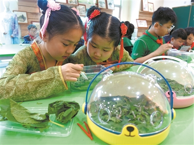 近日,安徽省阜陽市潁東區(qū)東盛路小學學生學習養(yǎng)殖“蠶寶寶”。該校開展“養(yǎng)蠶學技能、體驗絲綢文化”主題勞動教育課,讓孩子們感受勞動帶來的快樂和蠶桑文化的獨特魅力。王彪 攝