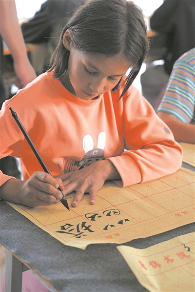 每到周末和寒暑假,在五十一團二小就讀的11歲女孩蘇海巴,都會和爸爸媽媽一起來到這里,蘇海巴在書院學書法、唱歌和跳舞,爸爸媽媽在家庭工坊工作。