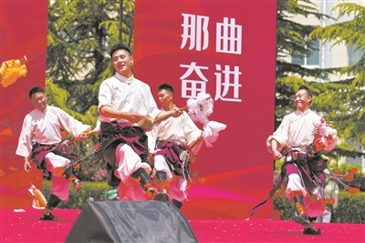 5月12日,在西藏職業(yè)技術(shù)學院職業(yè)教育活動周啟動儀式暨比如縣非物質(zhì)文化遺產(chǎn)進校園活動上,比如縣民族藝術(shù)團的演職人員在表演節(jié)目。新華社發(fā)(趙大志 攝)