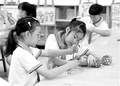 5月22日,太湖小學(xué)的學(xué)生們在特色課程上學(xué)習(xí)端午“艾草養(yǎng)生錘”的制作。從今年春季學(xué)期開始,浙江省湖州市吳興高新區(qū)太湖小學(xué)開始設(shè)置以太湖溇港非遺文化傳承為特色的跨學(xué)科項(xiàng)目化課程,既豐富了學(xué)生們的課間生活,提升全身心體驗(yàn)活動(dòng)的專注力和合作交往能力,又讓他們能積極參與到特色非遺文化的傳承和勞動(dòng)素養(yǎng)的培養(yǎng)中,引導(dǎo)學(xué)生德智體美勞全面發(fā)展。