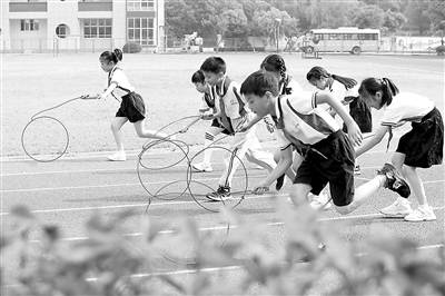 5月23日,在浙江省湖州市德清縣乾元鎮(zhèn)中心小學,學生們在滾鐵環(huán),享受課間運動的快樂。倪立芳 徐越 攝