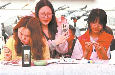 為讓社區(qū)文化生活錦上添花,求知書院美術(shù)學(xué)、環(huán)境藝術(shù)設(shè)計(jì)專業(yè)學(xué)生開展了校園寫生、色彩涂鴉、書法篆刻活動(dòng)。工業(yè)設(shè)計(jì)專業(yè)碩士研究生李直澄創(chuàng)作了“萬物共悅”主題的井蓋涂鴉作品,她說:“我很享受這種藝術(shù)表達(dá)方式,感覺我們的生活環(huán)境更有溫度了?!?/P>