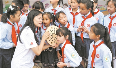 5月29日,在重慶市九龍坡區(qū)銅罐驛實(shí)驗(yàn)學(xué)校的操場上,在該校支教的音樂老師李玲莉(前排左一)向“渝好”歡唱團(tuán)學(xué)生們介紹樂器發(fā)出的聲音特點(diǎn)。