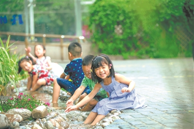 2013年,大學(xué)剛畢業(yè)的羅希悅來(lái)到花草園工作。當(dāng)時(shí),胡華告訴中班孩子們,花草園要修一個(gè)雨水花園。羅希悅就帶著他們不斷猜測(cè),并到處尋找它可能的位置,但都沒(méi)找到。后來(lái),大家采訪了保安于師傅,于師傅把他們帶到校園的一處空地,翻開(kāi)上面的板子,一塊蓄水池的蓋子露了出來(lái)。羅希悅與孩子們都很震驚:樓頂上的雨水,怎么就流到這里了呢?回到班級(jí),大家一起討論,一個(gè)叫吳朝宇的孩子根據(jù)想象,用玩具拼出了管道從樓頂最后進(jìn)入蓄水池的路線(xiàn)。