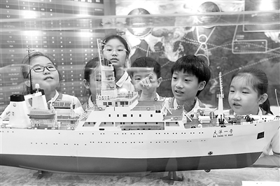 7月3日,在自然資源部第一海洋研究所中國大洋樣品館,山東省青島市市北區(qū)北山二路小學(xué)學(xué)生在參觀“大洋一號”綜合性遠(yuǎn)洋科考船模型。暑期,該校學(xué)生走進中國大洋樣品館,在豐富的海洋礦物樣品中,探索奇妙的海底世界,感受科技的魅力。