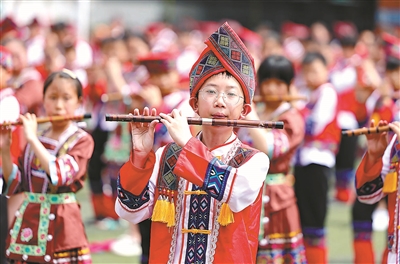 7月4日,貴州省銅仁市玉屏侗族自治縣印山民族小學學生在大課間吹奏簫笛。當?shù)貙⒑嵉汛底?、竹竿舞等特色項目融入大課間活動,讓學生們學習和傳承民族文化,營造積極、健康、向上的校園文化氛圍。胡攀學 攝