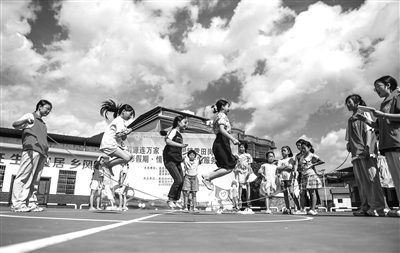 7月17日,在湖南省永州市道縣仙子腳鎮(zhèn)黃田崗村,孩子們和志愿者一起跳繩。