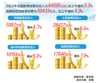 快報顯示,2023年全國教育經(jīng)費(fèi)總投入為64595億元,比上年增長5.3%。其中,國家財政性教育經(jīng)費(fèi)為50433億元,比上年增長4.0%。2023年全國學(xué)前教育、義務(wù)教育、高中階段教育、高等教育經(jīng)費(fèi)總投入分別為5382億元、28427億元、10154億元、17640億元,比上年分別增長4.7%、6.0%、6.2%、7.6%。