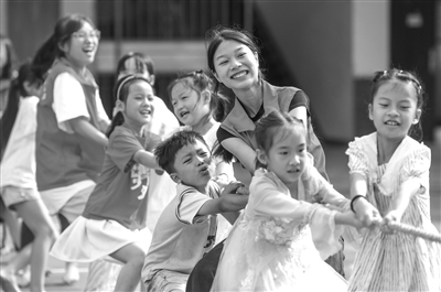 近日,湖南省永州市道縣仙子腳鎮(zhèn)黃田崗村,志愿者和孩子們一起進行拔河比賽。連日來,道縣團縣委組織大學(xué)生志愿服務(wù)隊走進鄉(xiāng)村開展“七彩暑假·情暖童心”志愿服務(wù)活動,通過開設(shè)唱歌、安全、學(xué)業(yè)輔導(dǎo)、體育活動等多元課程方式,關(guān)愛鄉(xiāng)村孩子,陪伴他們快樂過暑假。