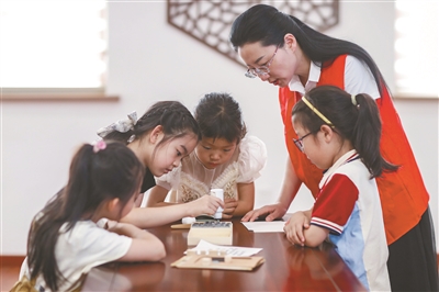 8月3日,在江蘇省興化市圖書館“活字印刷”體驗(yàn)館,學(xué)生在黨員志愿者的指導(dǎo)下體驗(yàn)活字印刷。當(dāng)日,興化市圖書館開展“書香潤童年 攜手印美好”活字印刷體驗(yàn)活動(dòng),讓學(xué)生領(lǐng)略活字印刷的獨(dú)特魅力,感受中國漢字之美。 周社根 攝