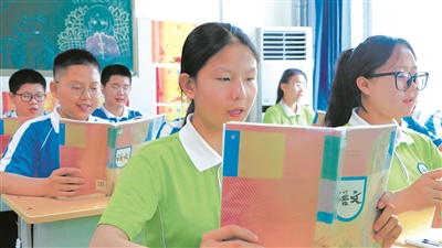 “泰山古稱岱山,有‘天下第一山’的美稱,泰的意思是安定、美好、極、通暢。在中國人心中,泰山就是一座大美之山?!痹谔┥綄W(xué)院附屬中學(xué)初二(10)班教室里,語文教師時曉筠正帶領(lǐng)學(xué)生學(xué)習(xí)統(tǒng)編語文教材七年級下冊里的《望岳》。窗外,抬頭便可見泰山的輪廓。