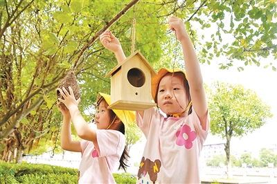 8月15日,湖南省永州市江永縣瀟浦鎮(zhèn)德智幼兒園暑托班的小朋友在懸掛鳥巢。時值全國生態(tài)日,該幼兒園舉行“掛巢引鳥”活動,以實際行動愛鳥護鳥,保護生態(tài)家園。 田如瑞 攝