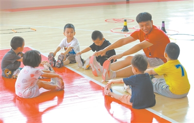 為培養(yǎng)幼兒對(duì)運(yùn)動(dòng)的興趣,河北省滄州市第一幼兒園東園區(qū)小班幼兒日前走進(jìn)籃球俱樂(lè)部,開(kāi)展“籃球悅童心 運(yùn)動(dòng)強(qiáng)體魄”暑期體驗(yàn)活動(dòng),讓幼兒在歡樂(lè)、自由的氛圍中享受運(yùn)動(dòng)的樂(lè)趣。圖為教練在帶幼兒進(jìn)行熱身活動(dòng)。