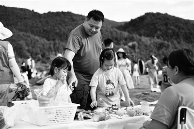 8月25日,家長帶著小朋友觀看大元社孩子們制作的手工藝品。在湖南省永州市寧遠(yuǎn)縣,一場鄉(xiāng)村青少年藝術(shù)節(jié)在九嶷山腳下的大元社舉行。寧遠(yuǎn)縣水市鎮(zhèn)游魚井村和朵山村的30多個孩子,與瑤族老人們一起唱瑤歌,身著自己設(shè)計、制作的服裝表演戲劇。2016年,畢業(yè)于美術(shù)院校的周燕在丈夫劉休的家鄉(xiāng)——水市鎮(zhèn)大元自然村成立大元社藝術(shù)文化交流中心,希望通過藝術(shù)的方式陪伴村里的留守兒童成長,彌補農(nóng)村藝術(shù)教育短板。除了平日里的藝術(shù)課程,每年寒暑假,多個高校的志愿者會來到大元社,為孩子們提供舞蹈、聲樂、文學(xué)創(chuàng)作等方面的課程。