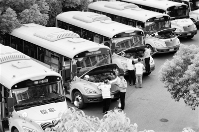 8月29日,江蘇省揚州市寶應(yīng)縣公安局民警在對校車進行安全檢查。秋季新學(xué)期開學(xué)在即,寶應(yīng)縣公安局組織民警對轄區(qū)中小學(xué)校、幼兒園的校車、消防、安防等設(shè)施設(shè)備進行檢查,并對校園保安進行應(yīng)急處突培訓(xùn),全力做好開學(xué)前的安全保障工作,迎接新學(xué)期的到來。沈冬兵 攝