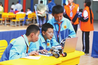 ③海北藏族自治州祁連縣小學(xué)生在參加機(jī)器人大賽。