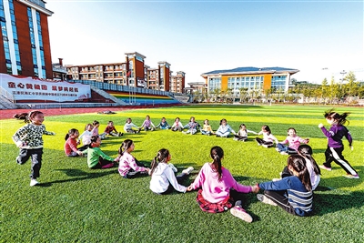 ②重慶市江津區(qū)海匯小學(xué)的孩子們在操場上愉快地做游戲。