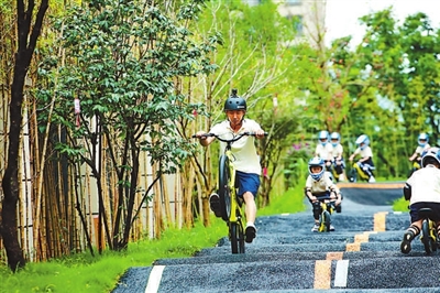 ③重慶市沙坪壩新絲路幼兒園的孩子在學(xué)習(xí)騎行。