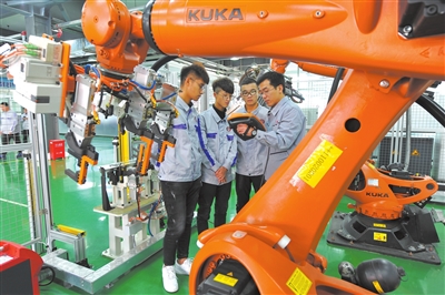 ③長春汽車職業(yè)技術(shù)大學(xué)學(xué)生在工業(yè)機(jī)器人技術(shù)中心參加實(shí)訓(xùn)。
