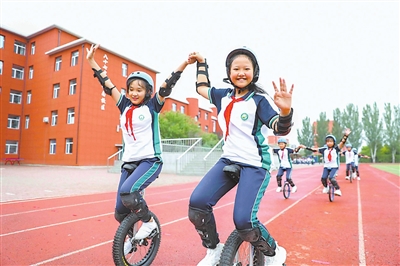 ⑤吉林省長春市綠園區(qū)同心小學(xué)學(xué)生在學(xué)?!盎盍Σ賵觥鄙向T獨(dú)輪車。 吉林省教育廳供圖