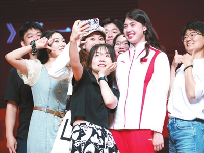 9月19日,張雨霏(右二)在活動現(xiàn)場與學生自拍合影。當日,新學期北京大學“冠軍講堂”暨《體育文化與創(chuàng)新精神》公選課開課,世界冠軍、巴黎奧運會獎牌獲得者張雨霏、曹緣、李雯雯和鄒敬園走上講臺,與北大學子互動交流。 新華社記者 雒圓 攝