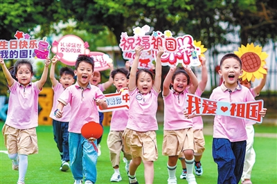 9月26日,在江蘇省興化市四牌樓幼兒園,小朋友們手持祝福標(biāo)語奔跑。國慶節(jié)臨近,多地幼兒園、小學(xué)舉辦形式多樣的國慶主題趣味活動,歡樂迎國慶。