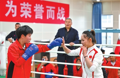 10月4日,烏魯木齊市體育運(yùn)動(dòng)學(xué)校邀請(qǐng)巴黎奧運(yùn)會(huì)拳擊女子54公斤級(jí)冠軍常園(右)和學(xué)生互動(dòng)。新華社記者 胡虎虎 攝