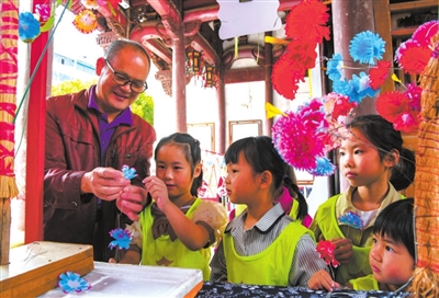 10月4日,在浙江省金華府城隍廟,小朋友觀賞手工藝人制作紙花。時(shí)寬兵 攝(新華社發(fā))