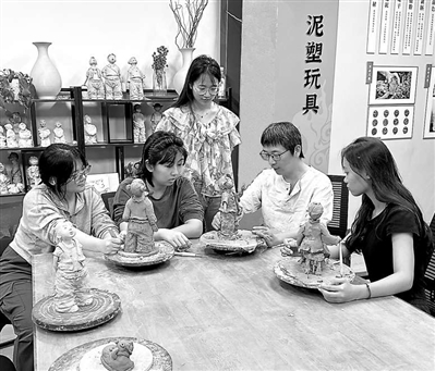 張吉鵬(右二)指導(dǎo)學(xué)生泥塑創(chuàng)作。學(xué)校供圖