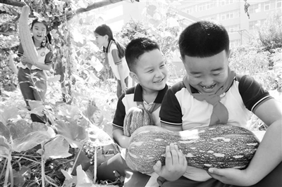 近日,在山東省高密市恒濤實驗小學(xué),小學(xué)生在展示收獲的方瓜。近年來,該校因地制宜,以校園農(nóng)場、校園果園的形式,讓學(xué)生們投入到勞動中,在豐富校園生活的同時,培養(yǎng)創(chuàng)新實踐能力,養(yǎng)成熱愛勞動的習(xí)慣。李海濤 攝