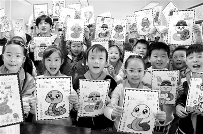 10月8日,在江蘇省鎮(zhèn)江市南徐小學(xué),江蘇科技大學(xué)志愿者和小學(xué)生一起展示設(shè)計(jì)繪制的蛇年生肖郵票。當(dāng)日,志愿者來(lái)到南徐小學(xué),指導(dǎo)學(xué)生設(shè)計(jì)、繪制蛇年生肖郵票,迎接“世界郵政日”的到來(lái)。石玉成 攝