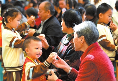 10月10日,江西省德興市泗洲幼兒園的小朋友們將一個(gè)個(gè)壽桃小點(diǎn)心送給自己的爺爺奶奶。該園在重陽節(jié)到來之際,組織開展“萌娃慶重陽,同樂傳孝道”活動(dòng),培養(yǎng)孩子們從小尊老、敬老、愛老的傳統(tǒng)美德。 卓忠偉 丁雯 攝