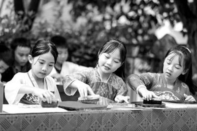 近日,在福建省龍巖市連城縣四堡鎮(zhèn)中心小學,學生體驗國家級非物質(zhì)文化遺產(chǎn)項目雕版印刷技藝,印刷廉潔書簽。通訊員 謝貴明 攝