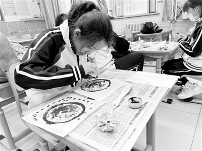 圖為北京市東城區(qū)的學(xué)生在教師的指導(dǎo)下拓印瓦當(dāng)。 張?chǎng)?攝